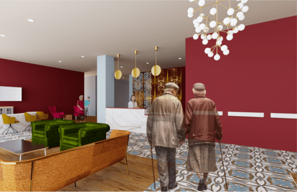 Venerable Company is the combination of new and old, united in a warm and comforting environment. To be venerable is to be wise and beyond your years, and worthy of respect; to be one with character. This concept hones in on the importance of companionship and the interlinking of connections made not only in the past that have stuck together, but those that have yet to be made in the future. Venerable Company provides comfort and beauty in aging through contrasting colors and designs that exemplify connection through antique and modern designs.